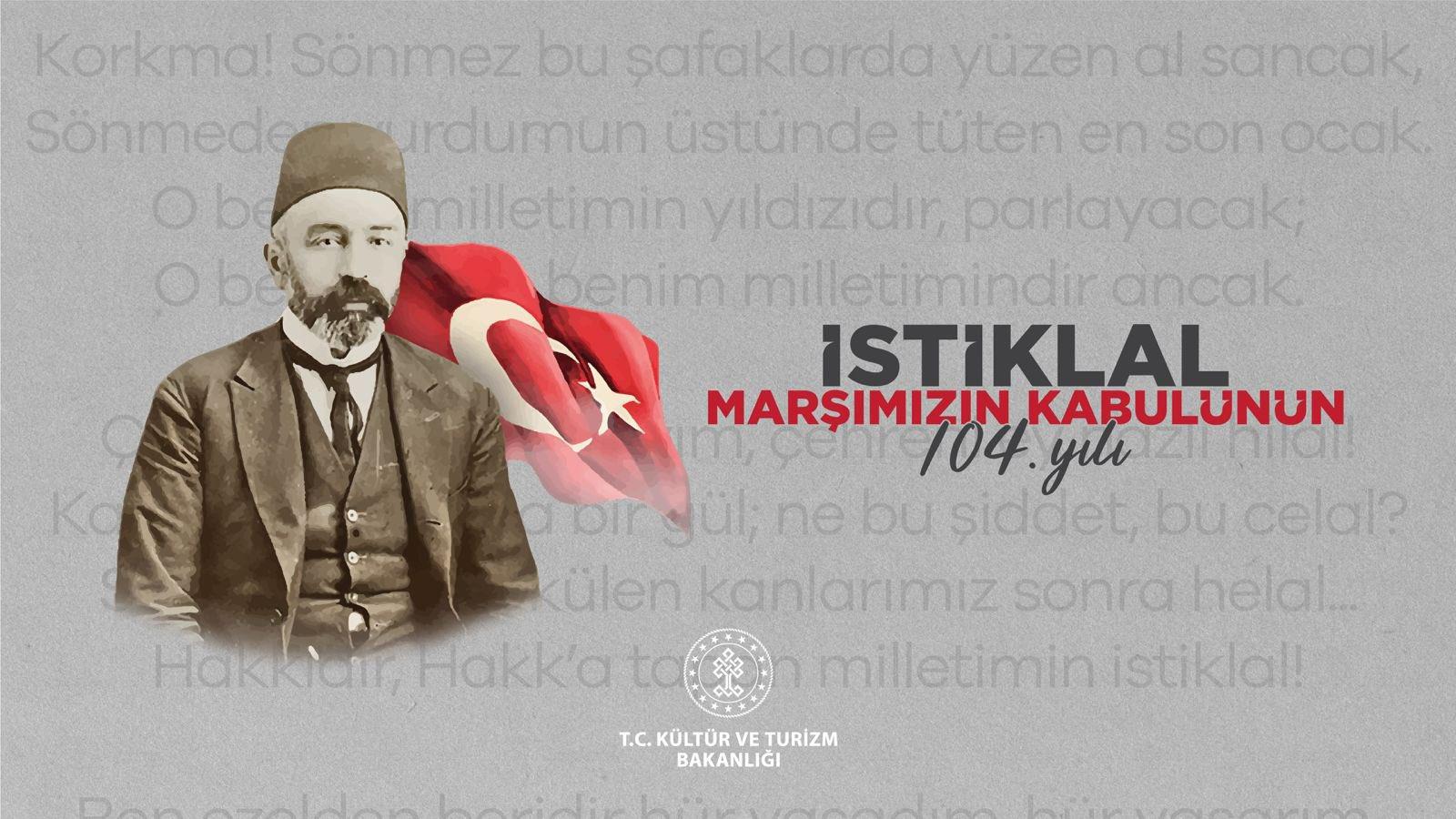 Bağımsızlığımızın eşsiz ifadesi olan İstiklal Marşımızın kabulünün 104. yılında, Millî Şairimiz Mehmet Akif Ersoy’u, Gazi Mustafa Kemal Atatürk’ü ve tüm kahramanlarımızı rahmet, minnet ve saygıyla anıyoruz.
